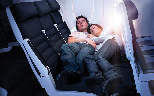 Economy class will be in a 3+4+3 configuration with a 33in seat pitch. Interestingly, 22 seat rows will feature the airline’s new ‘Skycouches’, whereby the arm rests will fold back completely while the footrest will rise up to sit flush with the main seat cushion. As a result, two passengers will be able to lie down on a longhaul flight. Air NZ says that it will offer the skycouch for a slight surcharge to two standard economy fares, but will still be lower than its premium economy fares.