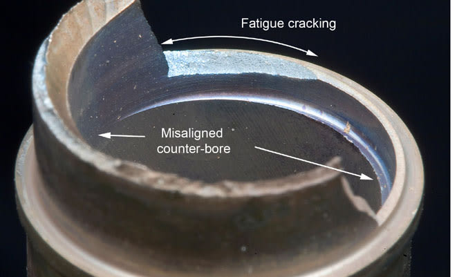 However, notes the interim factual report, “Since the ATSB’s Preliminary Report was issued, analysis of the oil feed pipe fracture surface has progressed and the investigation team has a better understanding of the failure mechanism. Technical reviews to date of the available evidence have established that the location of the fatigue cracking that was depicted in Figure 9 of the Preliminary Report is not the area of interest. The area of fatigue cracking and misaligned counter bore is now understood to be as shown in Figure 1 below [see image opposite].”