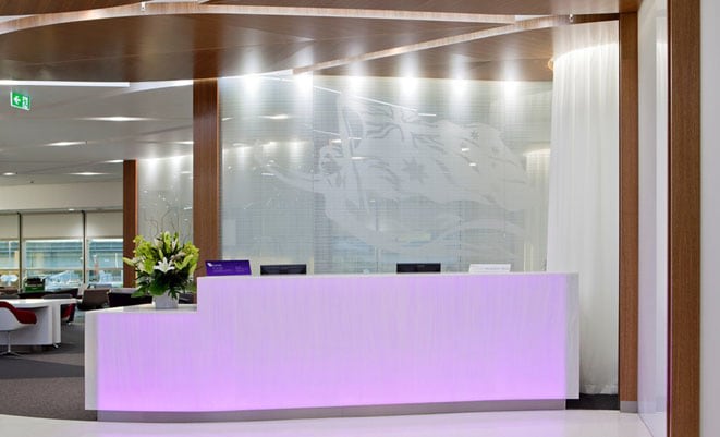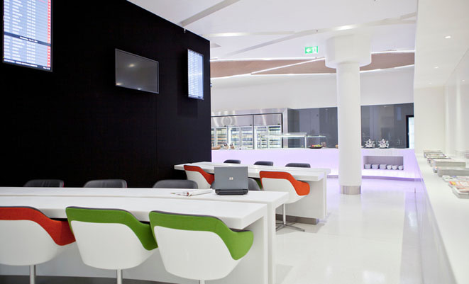 Design features of the lounge include Marblo bars, timber panelling and Barrisol panels in the ceiling, vertical glass screens, digital artwork by Daniel von Strummer, and Walter Knoll leather chairs.