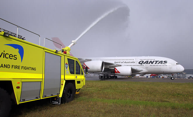 As QF32 VH-OQA touched down on Sydney’s Runway 16 Right at about 9.20am on Sunday morning, arriving on time despite fog at the airport earlier in the morning causing extensive flight delays. Taxiing into the international terminal, Airservices Australia ARFF fire trucks provided VH-OQA with a water canon salute to mark its return to Sydney.