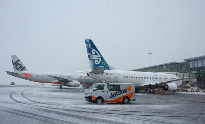 Christchurch International Airport staff went into a well-practiced snow clearing routine. The runway was cleared regularly but some snow was settling and there was considerable fluctuations in visibility. The terminal ran off its own generator system for much of the time at the request of the city power authorities in order to free up power supplies for the city.
