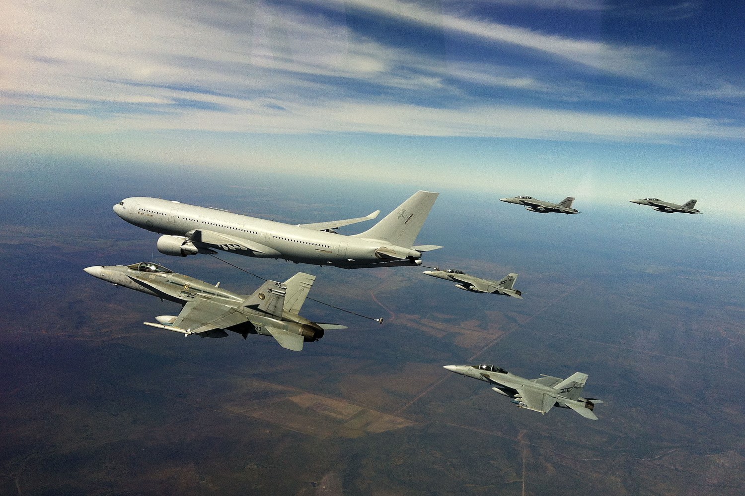 During the exercise the KC-30As refuelled classic and Super Hornets, as shown in this image taken by SQNLDR Paul Simmons over the arid lands of the Northern Territory.