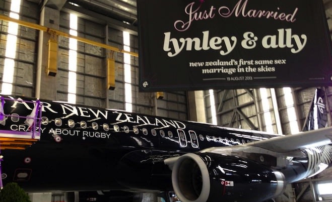 The airline says the couple exchanged New Zealand greenstones in place of traditional wedding bands before being pronounced as officially wed in front of their children, family and friends, as well as Modern Family actor and marriage equality campaigner Jesse Tyler Ferguson.