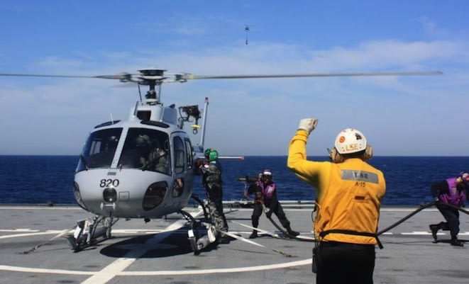 “A unique element of the deployment is the coordination and management of operating two aircraft simultaneously to a single spot,” said LCDR James Hawley, FLYCO in ESPS Cantabria. “This is a process that requires a high level of cooperation from Cantabria’s bridge, operations room, deck team, 723 (squadron) bmaintenance and aircrew,” he said.