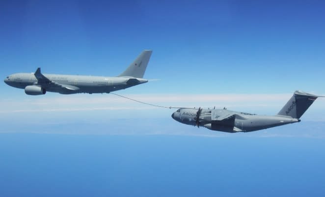 Airbus Defence and Space has released a series of images of a Royal Air Force A330 MRTT Voyager refuelling an A400M transport over southern Spain.