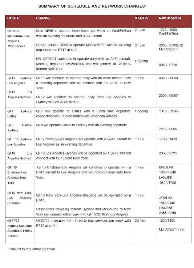As part of the changes announced on Friday, Melbourne will have 10 flights a week to Los Angeles year-round, with a second service (QF95/96) operated by Boeing 747-400 aircraft to run on Wednesday, Friday and Sunday evenings from January 21 2015.