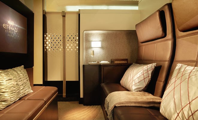 Etihad’s A380 aircraft have economy, business and first class, as well as the airline’s Residence concept, where two people share a living space, a bedroom and have access to their own bathroom.