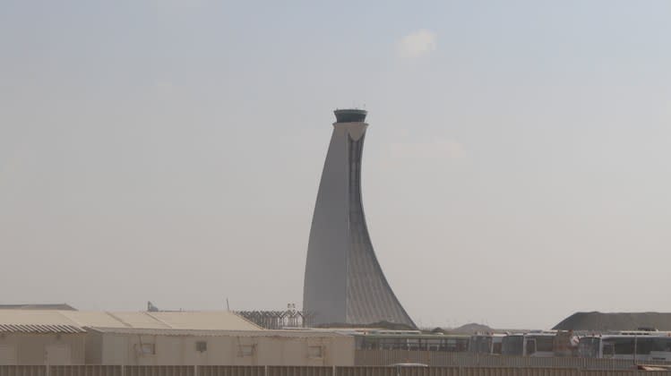 It will be the largest building in the entire emirate of Abu Dhabi, and its skeleton is already a landmark on the airport skyline, with external glass panels now being installed under the watchful eyes of its sail-like air traffic control tower, completed in 2011 in expectation of the midfield terminal building’s arrival.