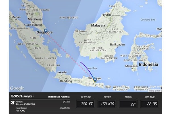An Indonesia AirAsia Airbus A320 disappeared from radar over the Java Sea whilst operating flight QZ8501 from Surabaya on the eastern end of Java to Singapore on Sunday morning. As of Monday morning, 24 hours after contact was lost with the aircraft, no announcement had been made of any trace of the aircraft.