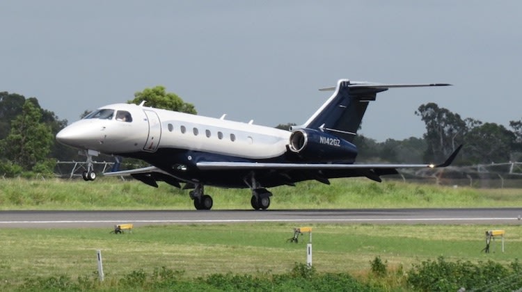 The first EMB-550 Legacy 500 delivered to Australia, N142GZ, landing at Rockhampton after a test flight on February 12. (Damian Freiberg/CQ Planespotting)
