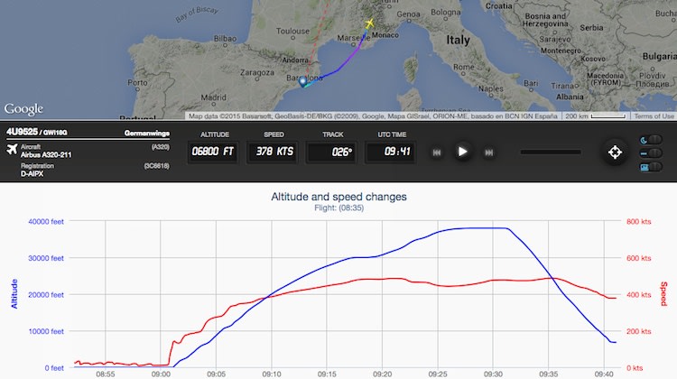 Flight tracking data showed flight 4U 9525 took off from Bacelona El Prat Airport bound for Dusseldorf at 0955 local time on Tuesday and had reached a cruising attitude of 38,000 feet before the aircraft entered a rapid descent.