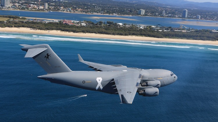 A pair of 4.3m tall white ribbons were applied to the fuselage of the 36 Squadron C-17 that flew over the Gold Coast and Brisbane on Friday.