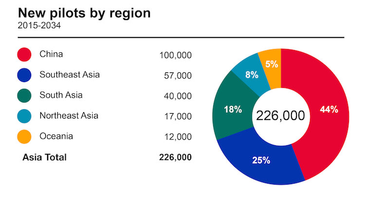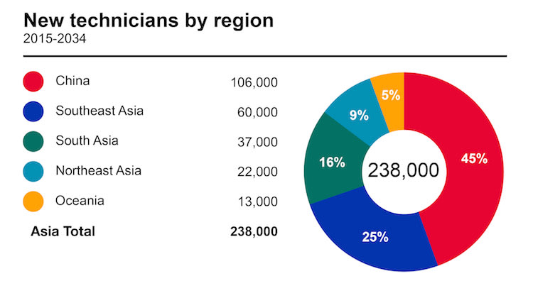 Overall, the Asia Pacific region was expected to need about 226,000 new airline pilots and 238,000 new technicians over the next two decades, with China requiring the bulk of those jobs.