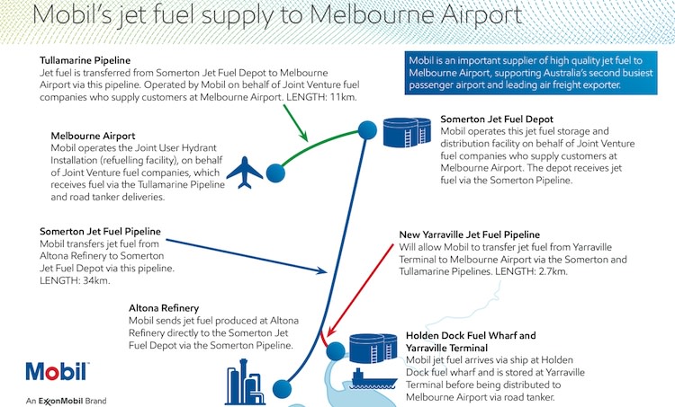 Mobil Oil Australia plans to boost jet fuel supplies to Melbourne Tullamarine through the construction of a new pipeline that will link its Yarraville fuel distribution terminal to the airport’s main fuel storage depot.
