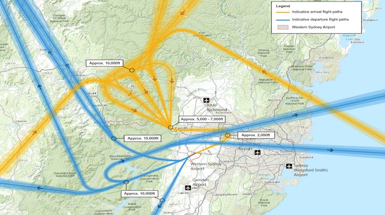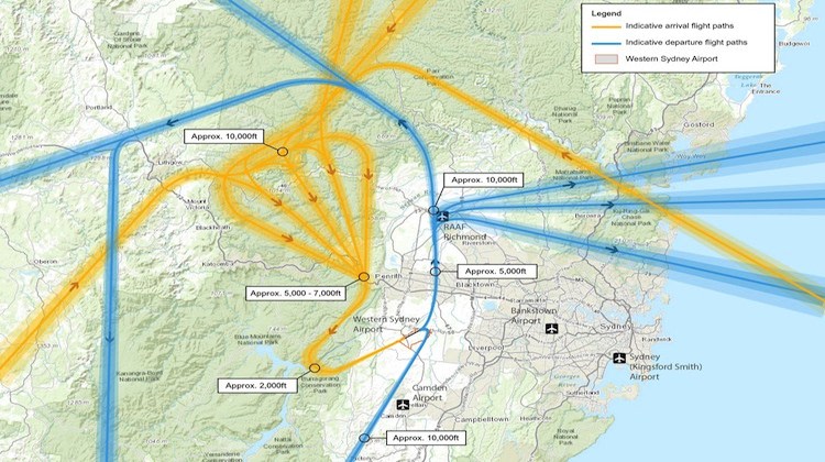 In the draft airport plan and environmental impact statement (EIS), aircraft flightpaths showed aircraft landing at the airport would be at between 5,000-7,000 feet over the Blue Mountains community of Blaxland just west of Penrith.