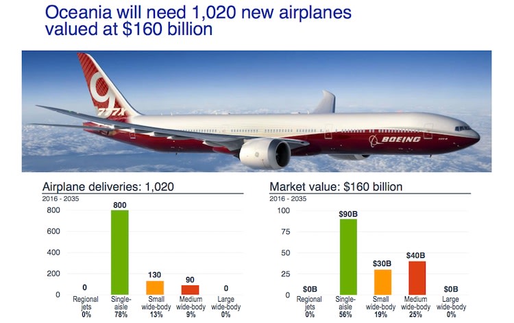 The manufacturer’s outlook is for airlines in the region – Australia, New Zealand and the nations of the South Pacific – to order 1,020 new aircraft worth $US160 billion over the next 20 years.