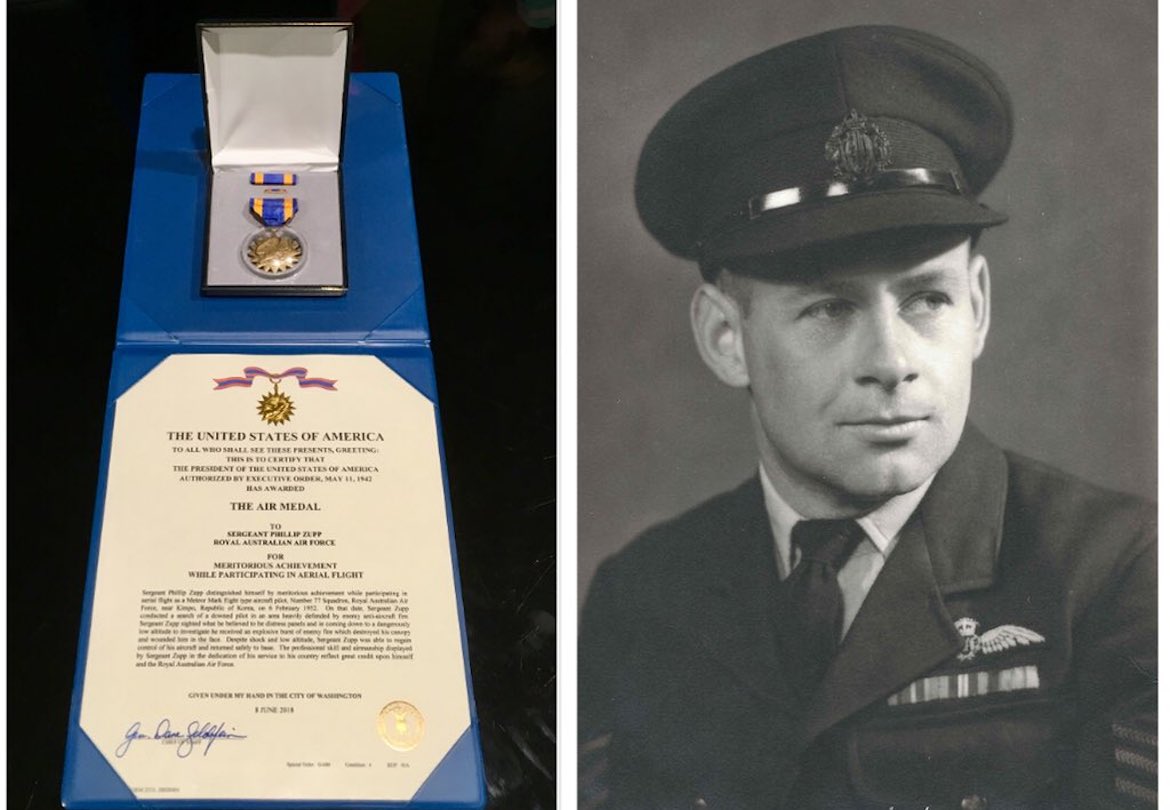 The official citation referenced Phillip Zupp’s efforts on February 6 1952, when he was a member of RAAF’s Number 77 Squadron participating in “aerial flight” in a Meteor F.8 jet fighter near Kimpo, South Korea.