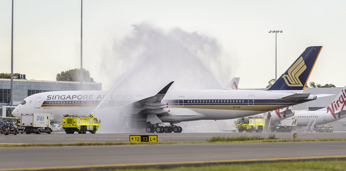 Today we welcomed @SingaporeAir's first A350-900 medium haul aircraft, to #Adelaide! SQ279 was greeted with a water cannon salute, while customers departing Adelaide on the inaugural service to Singapore were treated to a traditional Lion Dance, drinks and canapes. pic.twitter.com/BI1SebU6fH