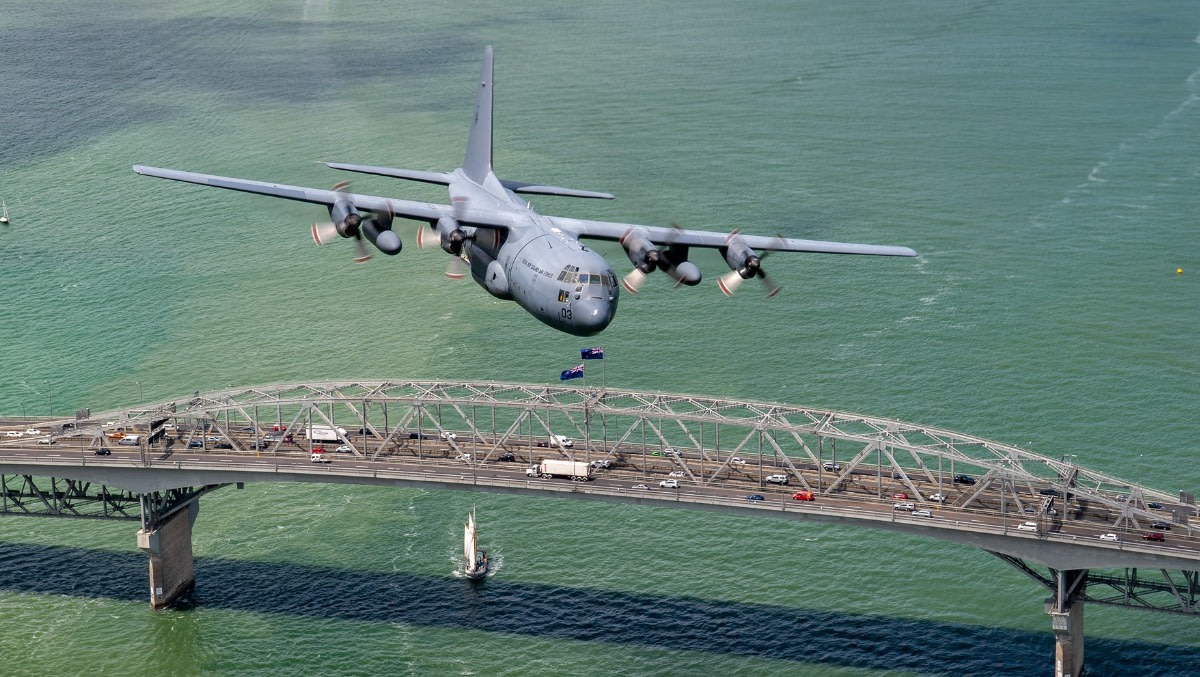 The first of five turboprop military transport aircraft set to retire, NZ7003, made its final flight from RNZAF Base Auckland over Devonport Naval Base and on to its final resting ground at Base Woodbourne on February 9.